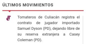 Aun que el equipo aun no lo hace oficial, Sam Dyson aparece entre los nuevos acuerdos anunciados por la LMP en la sección de “últimos movimientos” en su pagina, asimismo menciona que la libertad de Casey Coleman de su reserva extranjera.